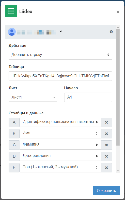 В Действиях можно выбрать либо добавление новых строк с данными подписчиков в таблицу, где каждая последующая запись начинается с новой строки, либо получение данных из таблицы с возможностью записи их в переменную.