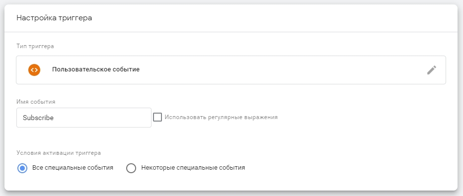 При создании триггера необходимо выбрать тип - Пользовательское событие и указать нужное имя события.