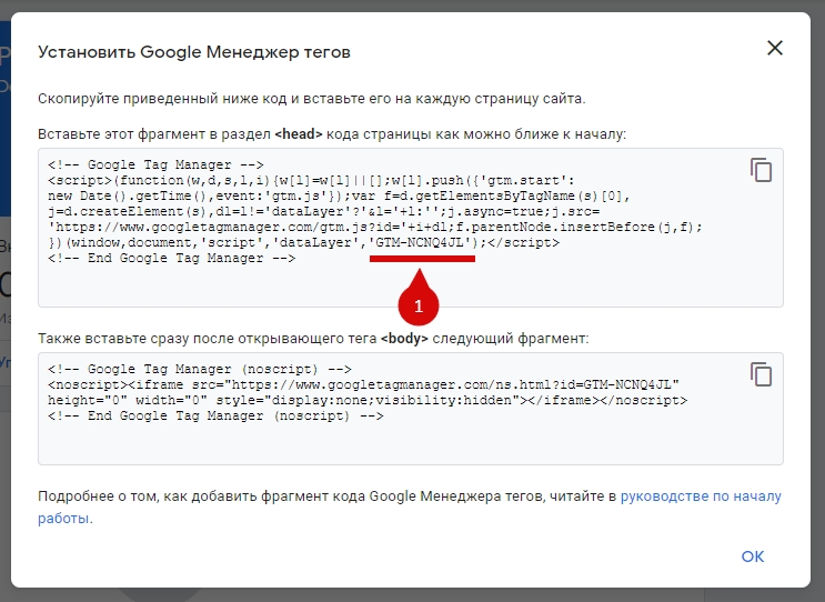 После создания аккаунта будет открыто окно с кодом Менеджера тегов, который должен быть установлен на каждой странице сайта. В нашем случае потребуется скопировать только его идентификатор (без кавычек).
