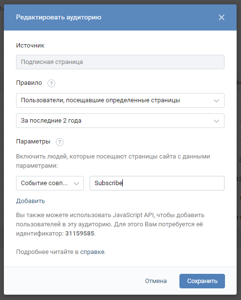 При создании аудитории ретаргетинга для подписчиков необходимо выбрать правило - Пользователи, посещавшие определенные страницы, в параметрах выбрать Событие совпадает и указать имя события.