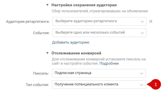 Если отслеживается конверсия получения потенциального клиента, то в настройках группы подписчиков можно указать Ценность конверсии, чтобы в статистике рекламной кампании показывался показатель Ценность конверсии.