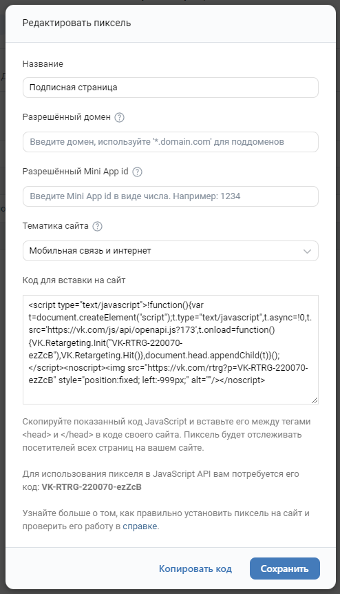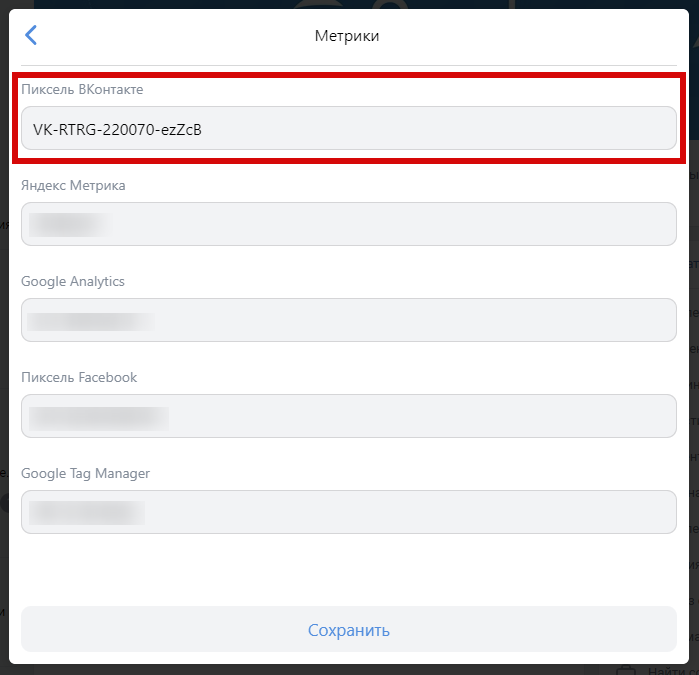 После создания у пикселя появится идентификатор вида VK-RTRG-XXXXXX-XXXXX. Этот идентификатор необходимо сохранить в кабинете в приложении в разделе Настройки - Метрики.