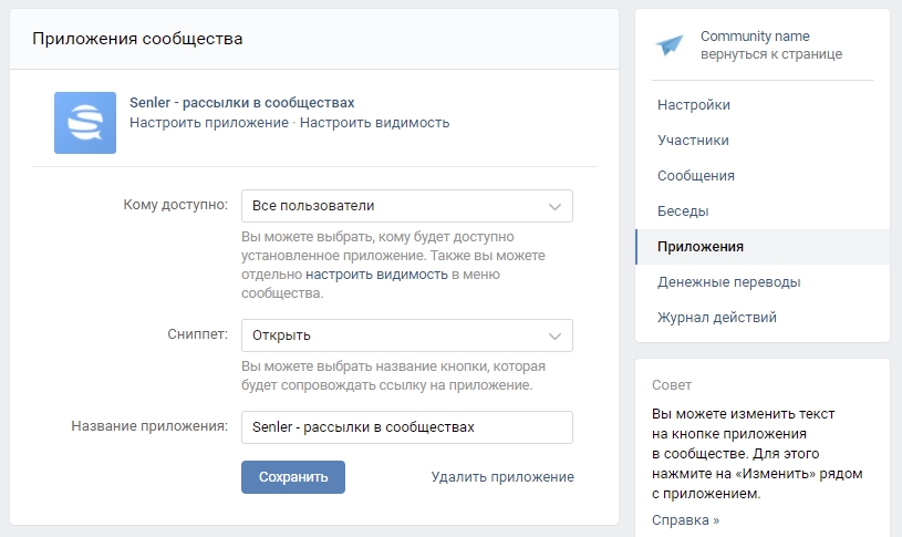 После установки приложения необходимо проверить его настройки. Для этого перейдите в Управление сообществом ВКонтакте и откройте раздел Приложения.