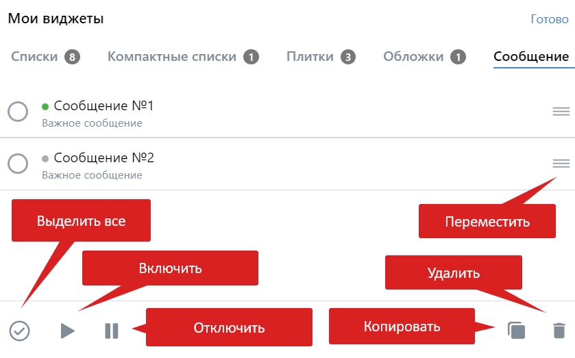 Включение, отключение, копирование и удаление происходит только выделенных виджетов.