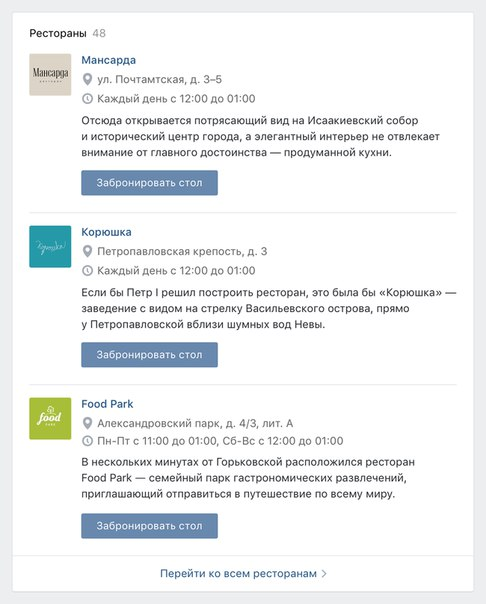 Выводит список объектов с описанием и кнопками для действий. Список может содержать до 6 объектов, если не указано подробное описание, и до 3 объектов, если оно указано.