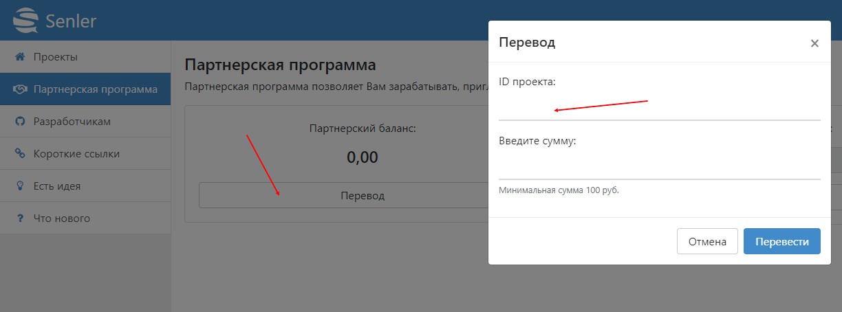 Для перевода средств введите номер проекта, в котором хотите оплатить услуги. В данном проекте у вас должен быть доступ любого уровня. Минимальная сумма перевода 100 р.