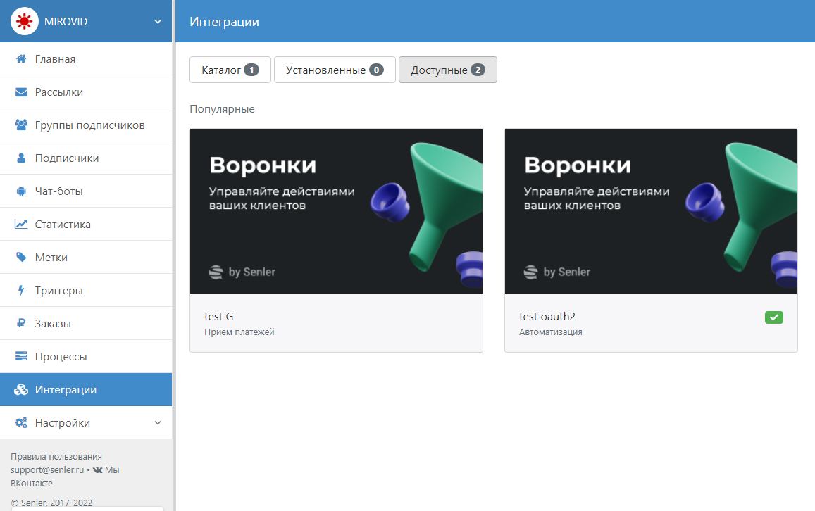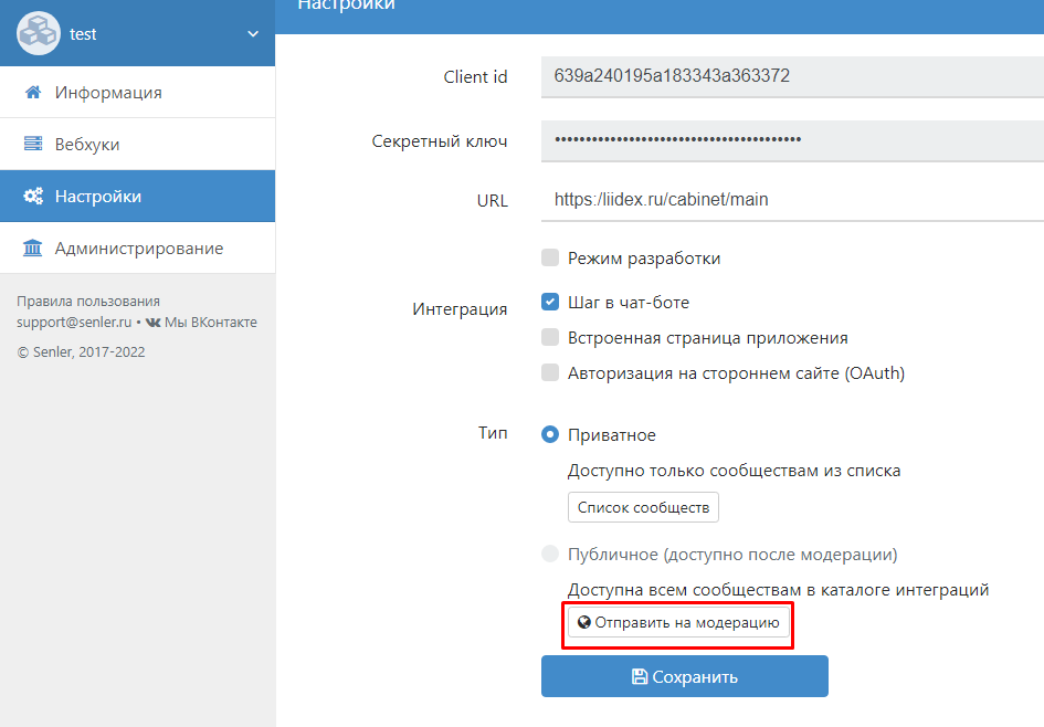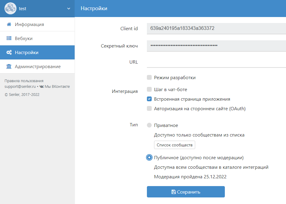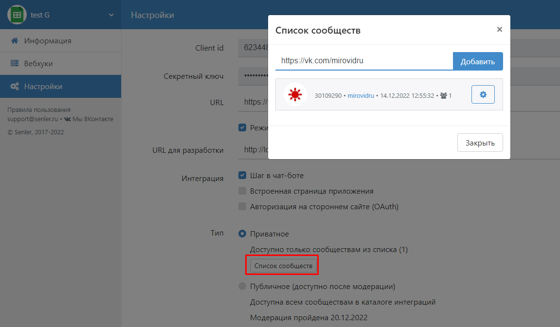 Интеграция может быть публичная - доступна после модерации, для размещения в общедоступном каталоге. И приватная - доступна для ограниченного числа сообществ
